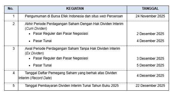 Adapun jadwal pembagian dividen interim tunai untuk tahun buku yang berakhir pada 31 Desember 2025 adalah sebagai berikut: