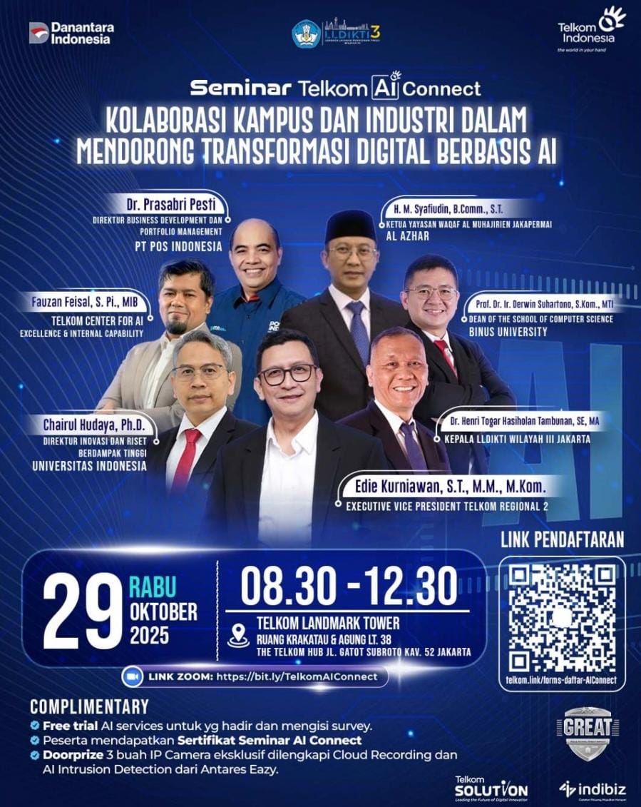 Seminar AI Connect dirancang sebagai forum strategis untuk membahas implementasi praktis AI dan peran penting kolaborasi lintas sektor. Para narasumber akan mengupas tuntas isu-isu penting, mulai dari pengembangan kurikulum AI di kampus, tantangan adopsi AI di lapangan kerja, hingga langkah konkret Telkom dalam membangun Center of Excellence AI sebagai jembatan antara dunia riset dan kebutuhan industri.