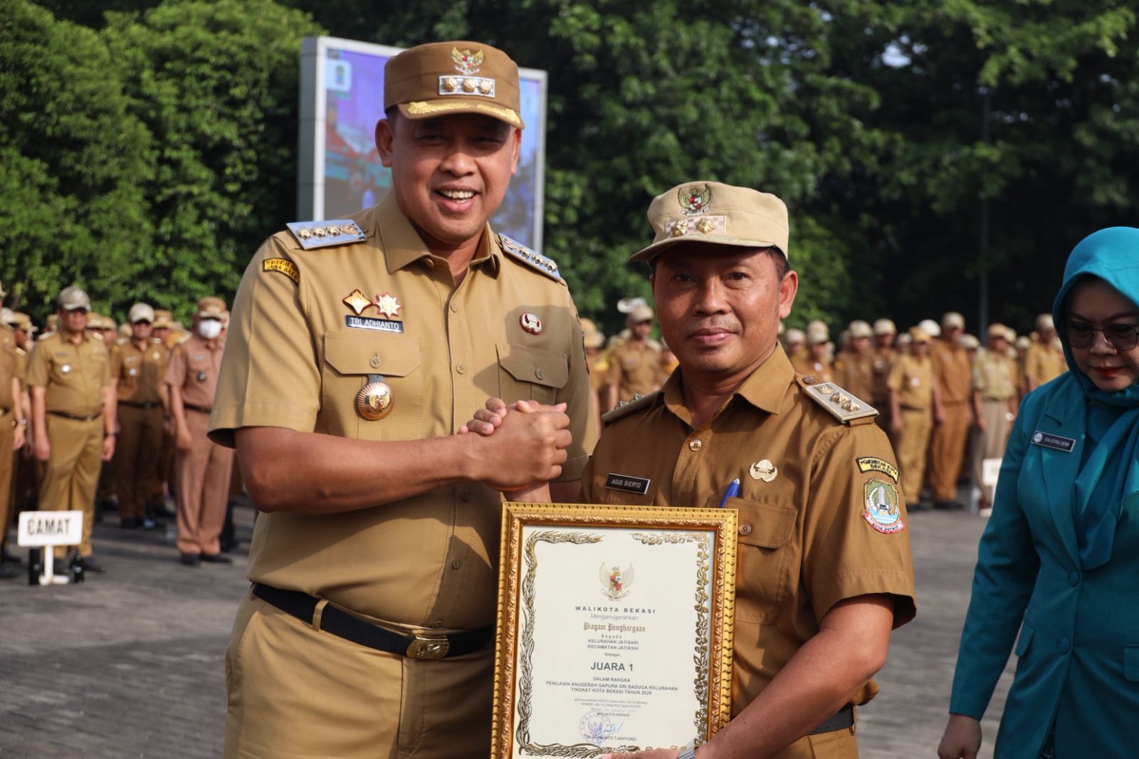 Penghargaan diserahkan langsung oleh Wali Kota Bekasi Tri Adhianto Tjahyono kepada Lurah Jatisari Agus Sucipto, disaksikan Camat Jatiasih Ashari di Plaza Pemkot Bekasi, Senin (13/10).