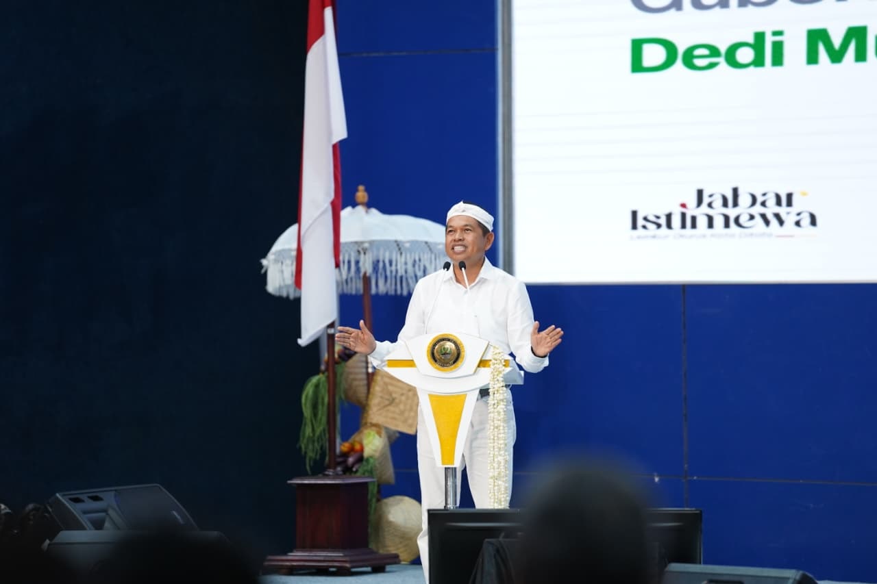 SAMBUTAN: Gubernur Jawa Barat, Dedi Mulyadi, memberikan sambutan dalam acara peluncuran Program Penguatan Ekosistem Perumahan bertema “Imah Merenah, Hirup Tumaninah”, sekaligus sosialisasi KUR Perumahan di Sasana Budaya Ganesha ITB, Bandung, Kamis (18/9). FOTO: ISTIMEWA